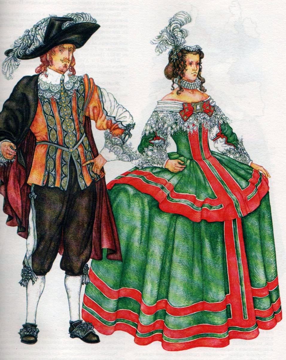 Но в области литературы и искусств конец XVI и весь XVII век явились для Испании поистине «золотыми». Лопе де Вега, Кальдерон, Тирсо де Молина и Сервантес в литературе; Мурильо Сурбаран и Веласкес в живописи - вот имена, которые дала Испания в XVII веке мировой культуре. Однако прогрессивные тенденции испанского искусства не отразились на характере моды, которая создавалась при дворе с его суровым этикетом и мрачным духом. Господство католической церкви по-прежнему накладывало свой отпечаток на характер испанского костюма.
